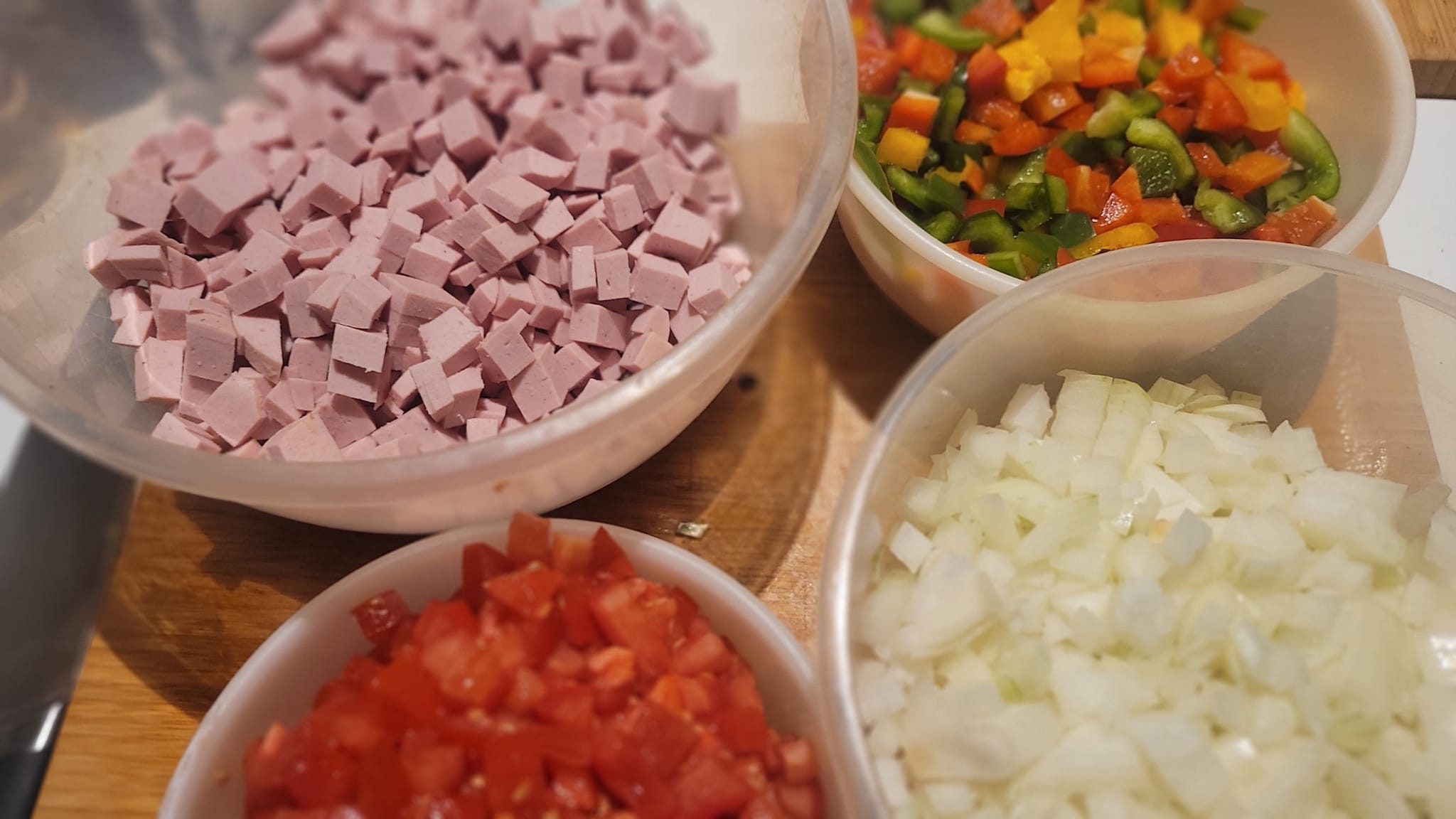 Lyoner, Paprika, Tomaten und Zwiebeln in ca. 0,75 x 0,75 x 075 mm große Würfel schneiden. So genau geht es aber nicht.