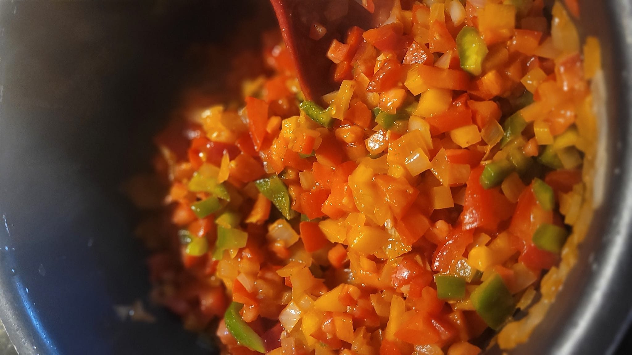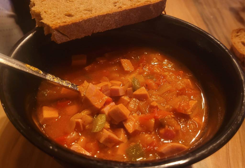 Paprika- und Tomatenwürfel anschütten und weiterdünsten. Mit Knoblauch- und Paprikapulver (jeweils ein Esslöffel) und mit Brühpulver würzen. Nach einigen Minuten mit Wasser aufgießen, bis alles knapp bedeckt ist und weiterköcheln lassen. Wenn die Konsistenz der Tomaten und Paprika sich ändert bzw. auflöst, die Fleischwurstwürfel hinzufügen. Solange köcheln lassen, bis die Gesamtkonsistenz dicker wird… oder mit Speisestärke andicken. Am Ende nochmal mit Salz, Pfeffer, Brühpulver, Chili und Knoblauch nachwürzen.